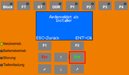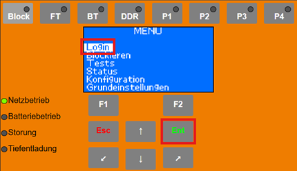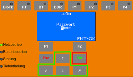 3. Mit Betätigung der Taste „ENT“ auf „Login“ klicken und mithilfe der Pfeiltasten das Installateurpasswort 9174 eingeben. Anschließend zweimal mit „ENT“ bestätigen