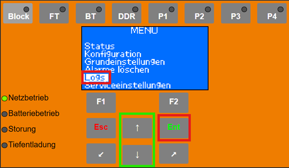 4. Mit den Pfeiltasten auf den Menüpunkt „Logs“ navigieren und mit „ENT“ bestätigen
