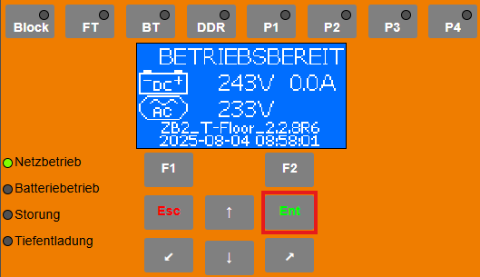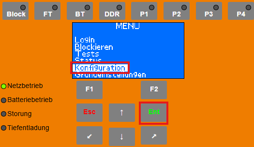 Mithilfe der Pfeiltasten das Passwort für den Installateur eingeben und zweimal mit „ENT“ bestätigen.Menü „Konfiguration“ öffnen