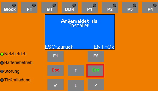 Mit den Pfeiltasten (rauf/runter) zum Menüpunkt „Login“ navigieren und mit „ENT“ bestätigen.Login auf Installateurebene