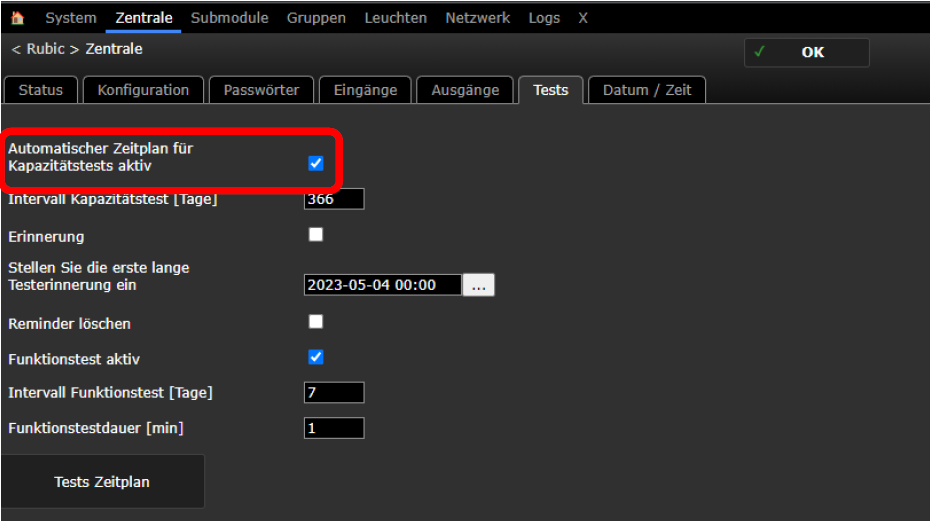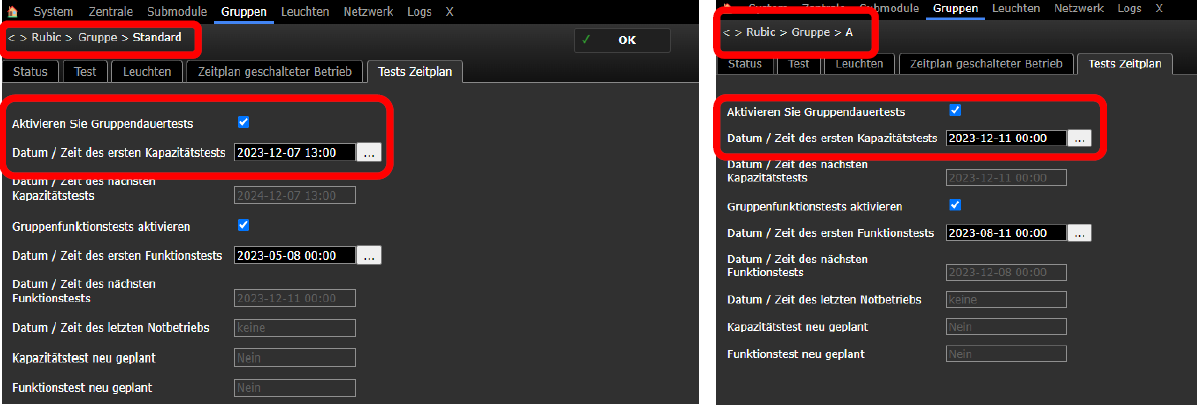 Abschließend muss das Datum und die Uhrzeit in die jeweilige Prüfgruppen (Standard, A, B etc.) eingetragen werden + der Gruppendauertest aktiviert werden.