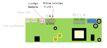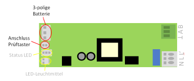 - Bei Betriebsgeräten mit 3-poligem Batterieanschluss ist ein dedizierter Kontakt für einen Prüftaster* vorgesehen. Dieser Kontakt muss für 3 s, zum Beispiel mit dem Prüftaster, gebrückt werden.