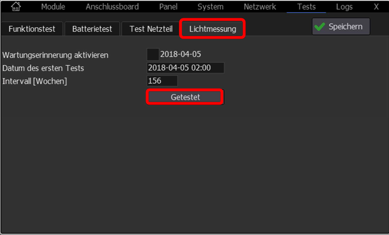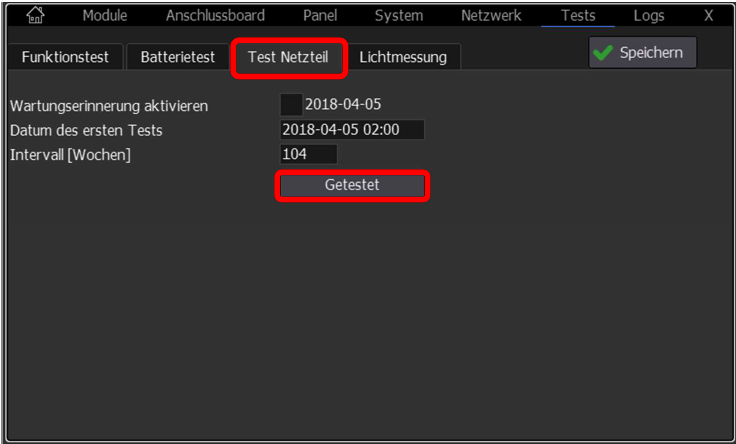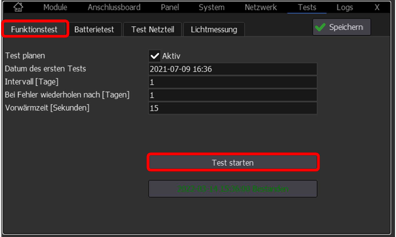3. Im Menü Tests kann der Funktionstest oder der Batterietest ausgewählt werden. Über "Test starten" kann ein manueller Test gestartet werden.